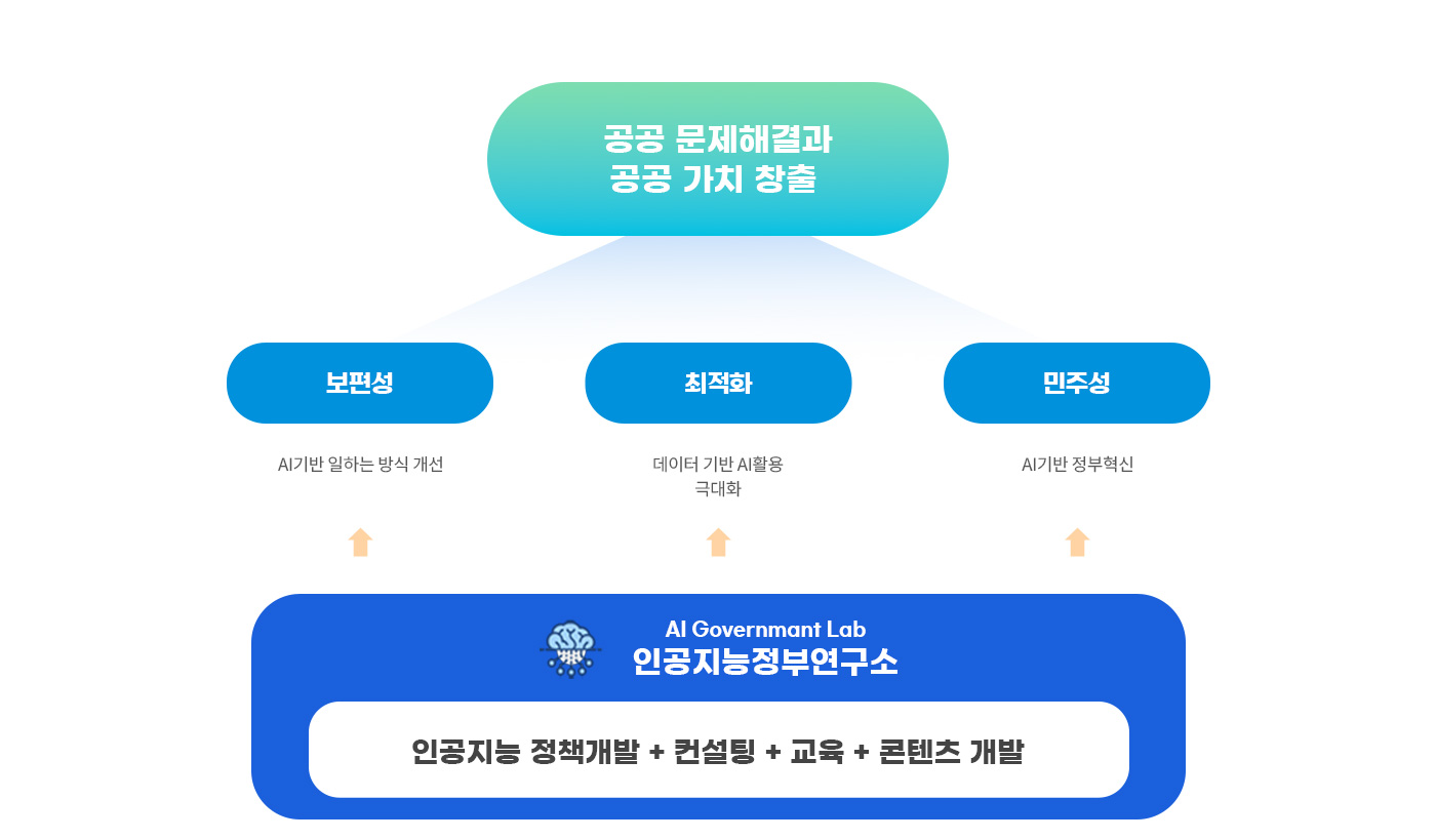 인공지능정부연구소는 디지털 전환과 인공지능정부 구현에 관한 첨단 방법론을 활용한 실용적 연구와 Best Practice 창출을 통해 아래 세 분야와 관련된 정책(서비스)개발 및 실행, 컨설팅, 교육을 지원함으로써 정부(중앙 및 지방)와 공공기관을 중심으로 한 디지털사회의 지속 가능한 성숙과 발전에 기여한다.