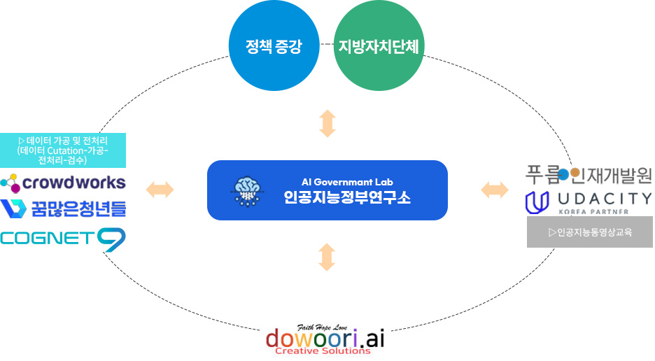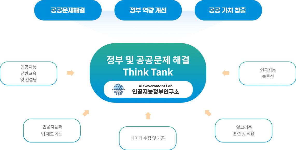- 인공지능정부연구소는 국-내외 전문기관과의 협력적 Partnership을 구축하여 정부(중앙 및 지방) 및 공공기관의 디지털 전환 역량의 강화와 고도화를 위하여 최선을 다할 것입니다.