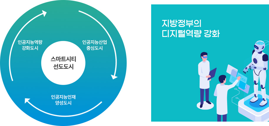 - 지방정부의 디지털 전환 역량을 향상시키면서 인공지능기반 스마트시티의 선도적 역량과 인공지능 활용능력을 제고함으로써 인공지능 산업중심도시로의 도약을 지원합니다.