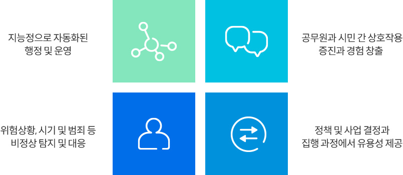 - 증강된 정부(기관)의 잠재력을 최대한 발휘하고, 행정 프로세스를 지능적으로 자동화하며, 시민들에게 긍정적 영향을 미치면서 보다 나은 의사결정을 내릴 수 있도록 통찰력을 제공할 것이므로 활용 역량을 갖추는 것이 필수적입니다.